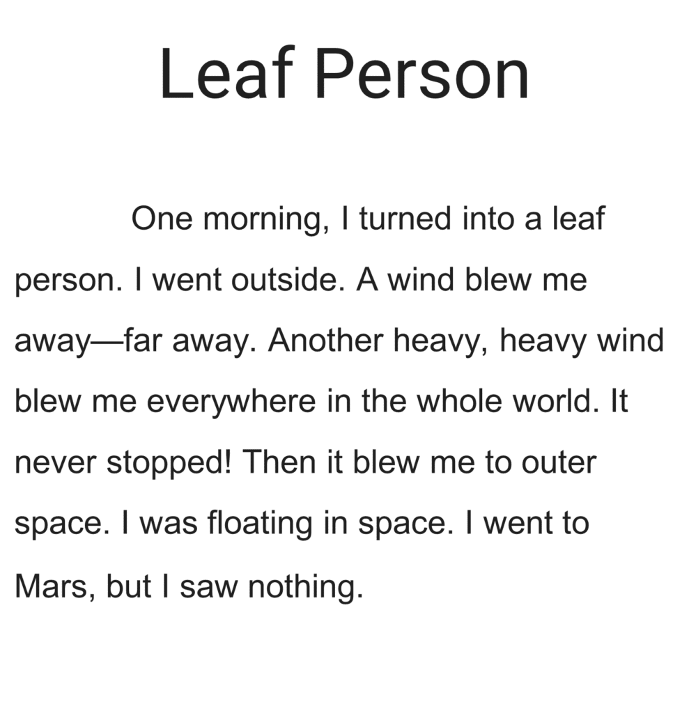 – “Leaf Person” is a strong example of creative writing by a year 1-2 student by using simple and complex sentence structure, including coordinating conjunctions to make compound sentences, ‘I didn’t know where I was, so I went on a rocket.’ This shows a strong grasp of cause and effect and sequencing of the story.