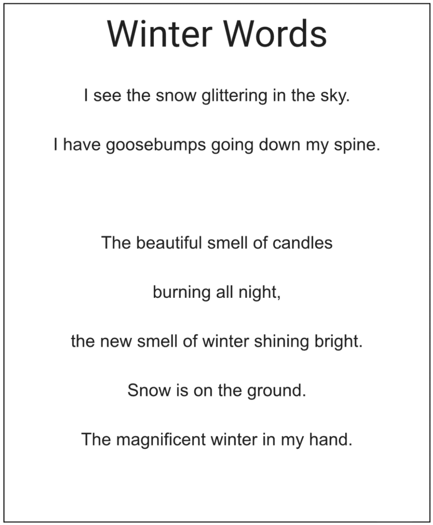 – This poem by a year 2 student balances literal sights, such as ‘snow on the ground’ with more metaphorical and sensory insights; ‘the magnificent winter in my hand.’