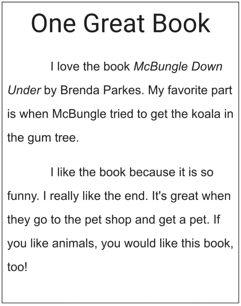 – Unlike a report, a review invites personal opinion and reflection evidenced by the students reference to their ‘favourite part.’ Describing elements of the story in the student’s own words builds a foundation of strong analytical and summarising skills.